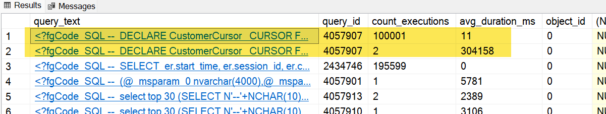 Also note within the same timeframe this query has the same query_id listed twice (4057907). One of these entries is for the OPEN, the other of these entries is for the FETCH NEXT. While I have not been able to find a clear indicator as to which of these is associated, it’s probably safe to assume the entry with low count_executions (2) is probably the OPEN. The count_executions (100001) with the higher count is most likely the FETCH. Another tip off is the OPEN call likely takes longer as noted by the avg_duration_ms.